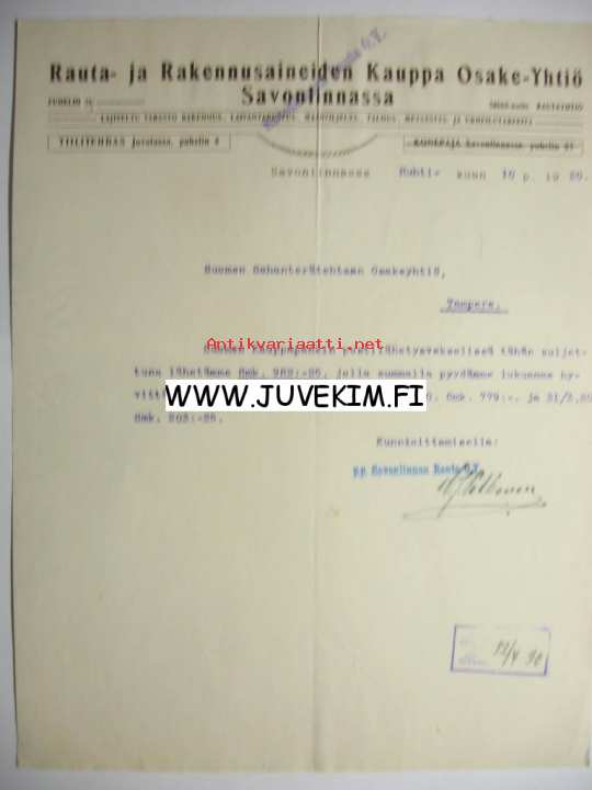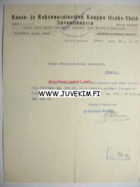 Rauta- ja Rakennusaineiden Kauppa Osake-Yhtiö Savonlinna 10.4.1920 -asiakirja