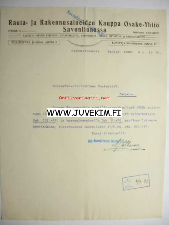 Rauta- ja Rakennusaineiden Kauppa Osake-Yhtiö Savonlinna 4.3.1920 -asiakirja