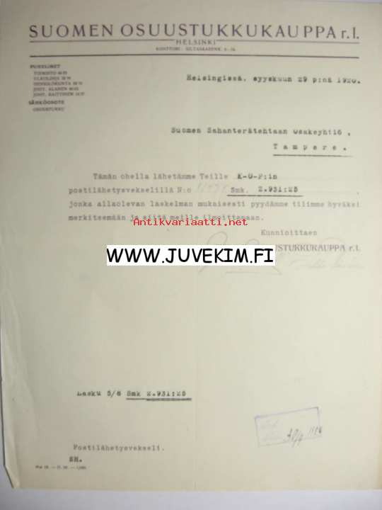 Suomen Osuutukkukauppa r.l. Helsinki 29.9.1920 -asiakirja
