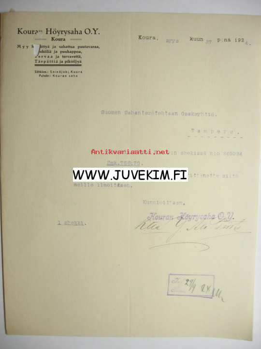Kouran Höyrysaha O.Y. Koura 27.9.1924 -asiakirja