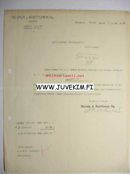 Nevala & Karttunen Kuopio 1923 -asiakirja
