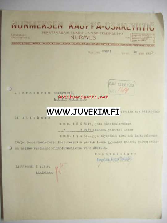 Nurmeksen Kauppa-Osakeyhtiö Nurmes 10.4.1923 -asiakirja