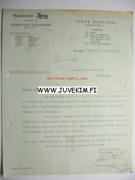 Osakeyhtiö Agros Turku 19.5.1923 -asiakirja