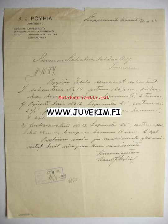 K. J. Pöyhiä Lappeenranta 17.11.1922 -asiakirja