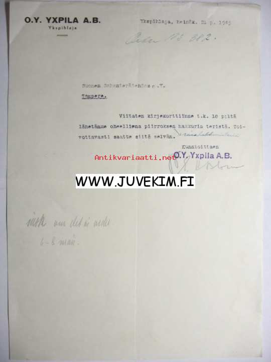 O.Y. Yxpila A.B. Ykspihlaja 21.7.1945 -asiakirja