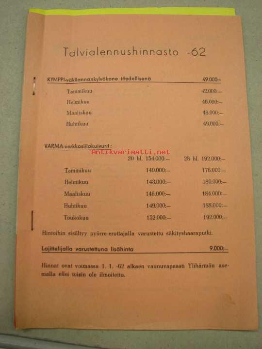 Pohjanmaan Tehtaat Oy -talvialennushinnasto