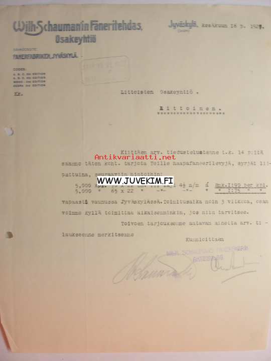 Wilh. Schauman'in Faneritehdas Osakeyhtiö Jyväskylä 16.6.1927