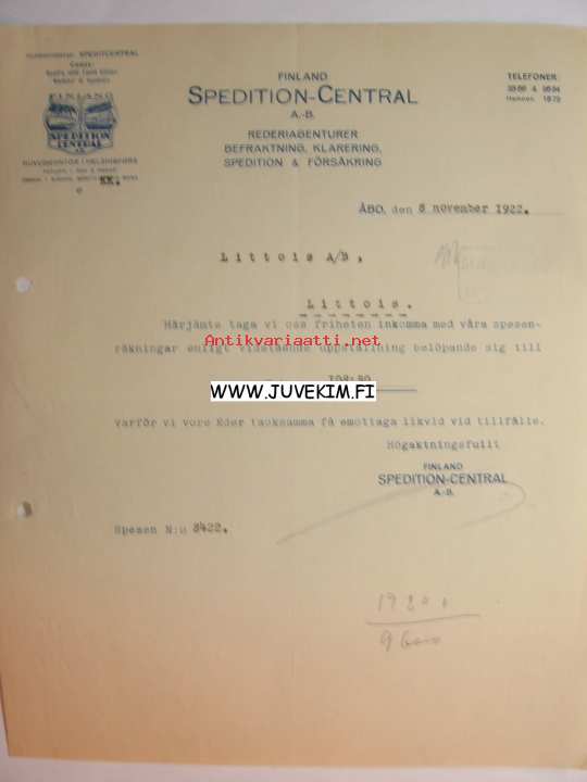 Finland Spedition -Central A.-B. Åbo/Turku 8.12.1922