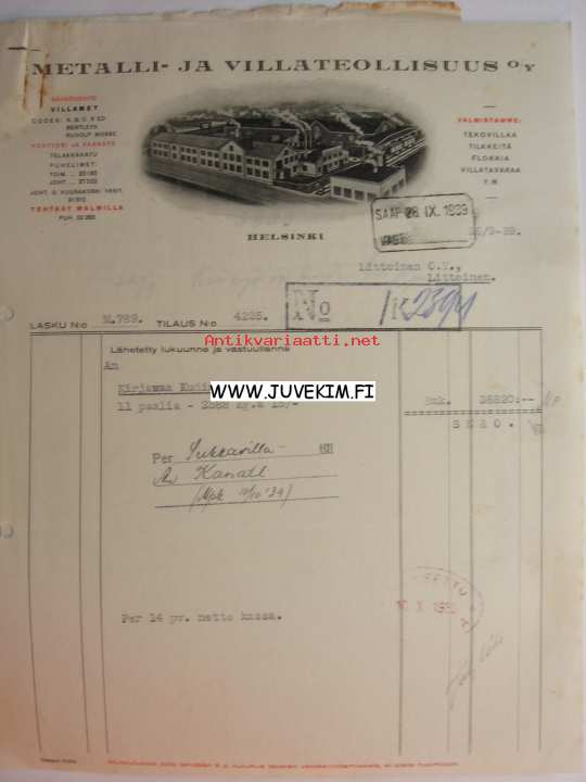 Metalli- ja villateollisuus O/Y Helsinki 26.9.1939