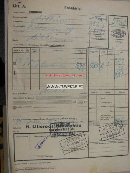 Littoinen Oy -VR rahtikirja leimattu; Tampere