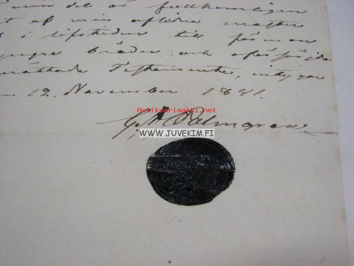 Allekirjoittaja, Robert Palmgren toteaa olevansa tyytyväinen edesmenneen tätinsä, Helena Qvistin testamenttiin -asiakirja 12.11.1841