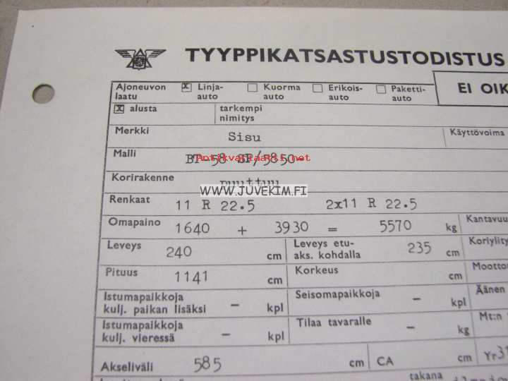 Sisu BT-58 SP/5850 -tyyppikatsastustodistus, kopio