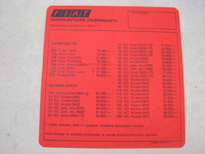 Fiat tavara-autojen ohjehinnat -mainoskortti