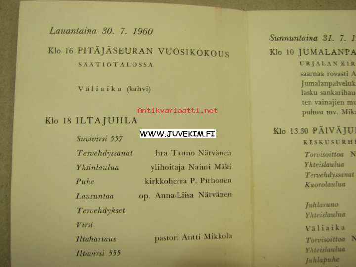 Muolaalaisten Pitäjäjuhla Urjalassa 30-31.7.1960 -ohjelmakortti