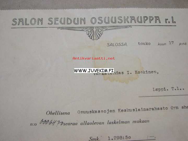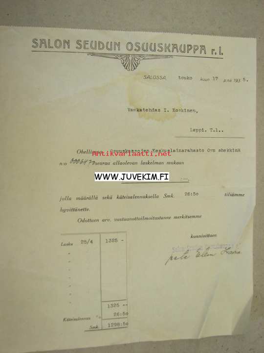 Salon Seudun Osuuskauppa 17.5.1935 -asiakirja