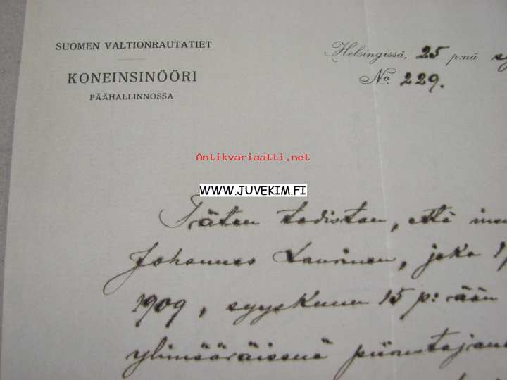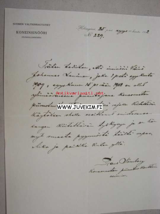 Suomen Valtionrautatiet, Koneinsinööri päähallinnossa, 25.9.1912 -asiakirja