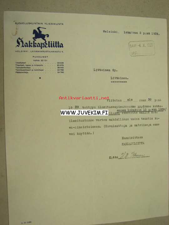 Hakkapeliitta, Helsinki, 5.10.1939 -asiakirja
