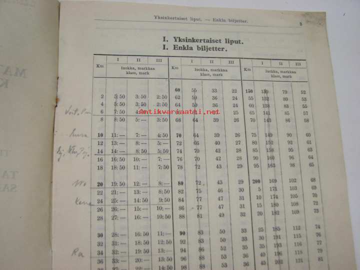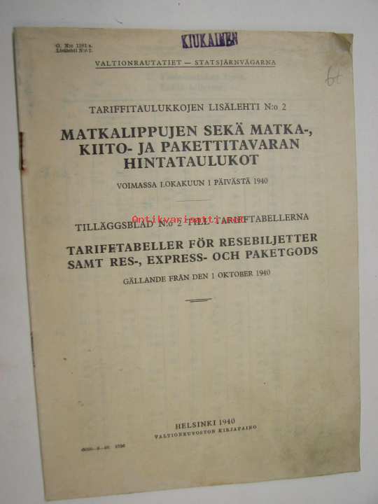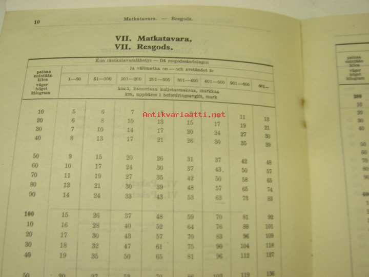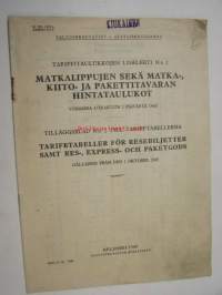 VR Valtionrautatiet matkalippujen sekä matka-, kiito- ja pakettitavaran hintataulukot 1940