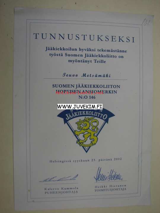 Suomen Jääkiekkoliiton Hopeisen Ansiomerkin nr 146 myöntökirja