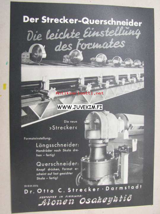 Dr. Otto C. Strecker Darmstadt / Alonen Oy -paperiteollisuuden pituusleikkurin mainos