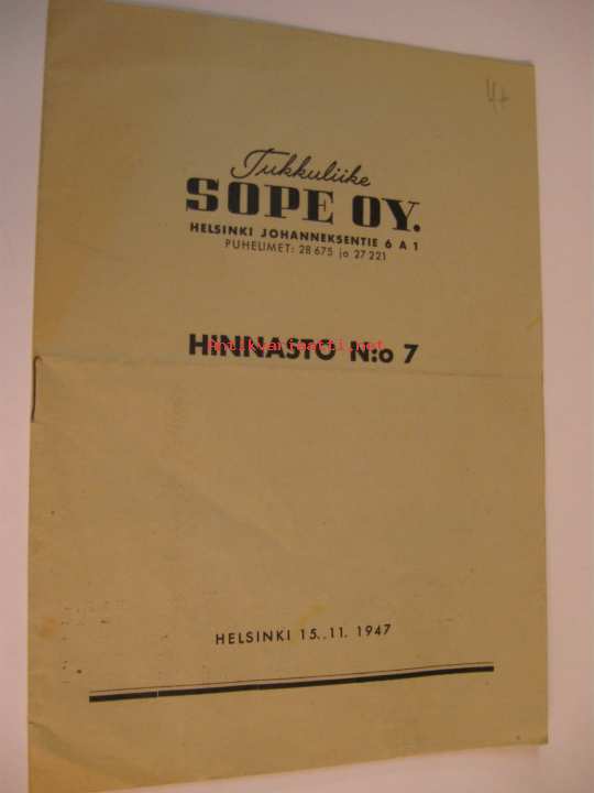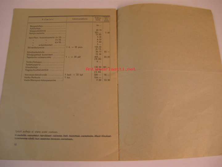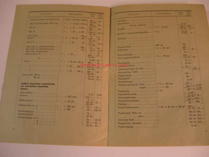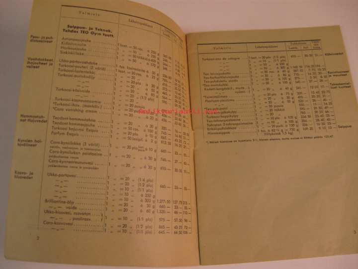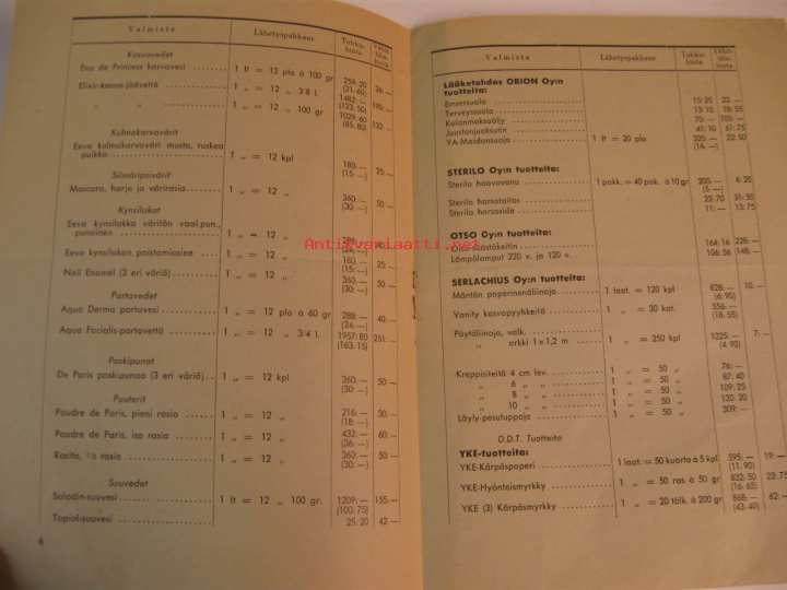 Saippua- ja Teknok.tehdas TEO Oy:n, lääketehdas Orionin, Sterilo Oy:n, Otso Oy:n, Serlachius Oy:n ja lisäksi muidenkin tehtaiden tuotteita, tukku- ja vähittäishinnat.