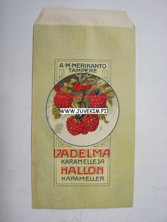 A. M. Merikanto Tampere Vadelmakaramelleja -makeispussi. Käyttämätön kauniskuvioinen paperipussi ( 9 x 17 cm) sotaa edeltävältä ajalta