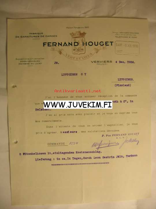 Fernand Houget Verviers 4.12.1936 -asiakirja