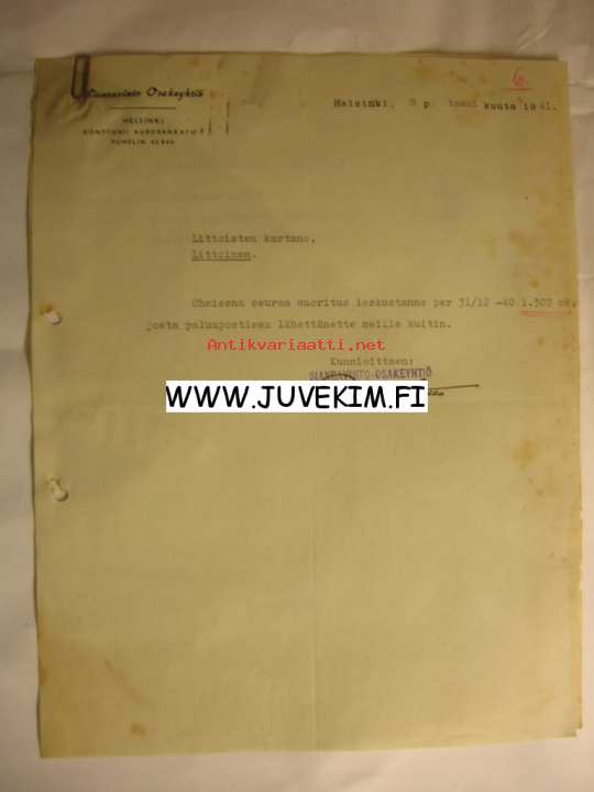 Sianravinto Osakeyhtiö Helsinki 8.1.1941 -asiakirja