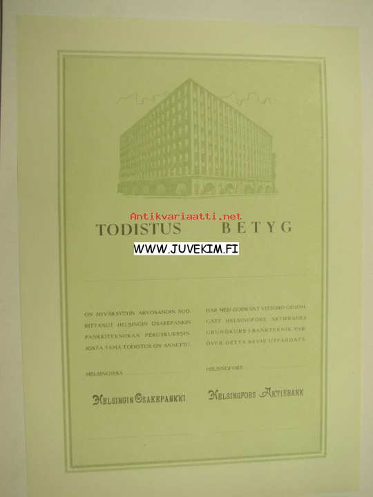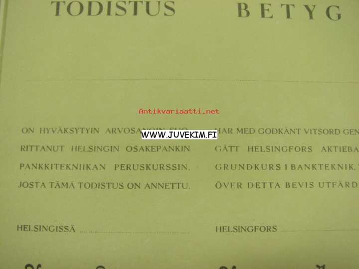 Helsingin Osakepankin pankkitekniikan peruskurssi -kurssitodistus