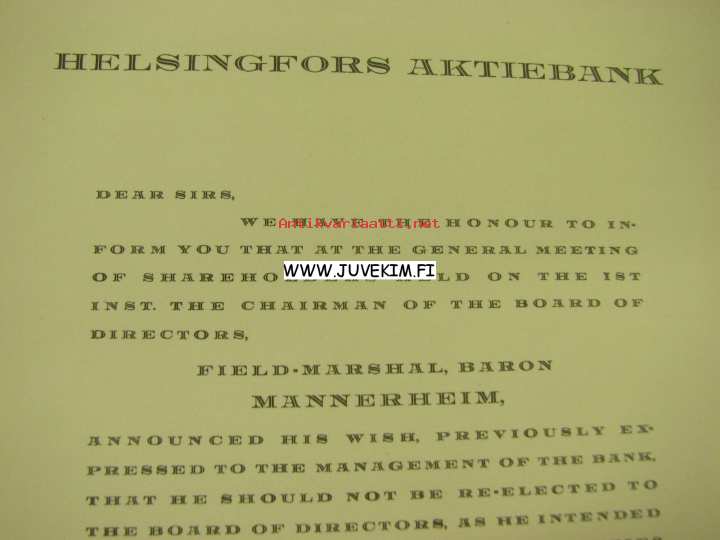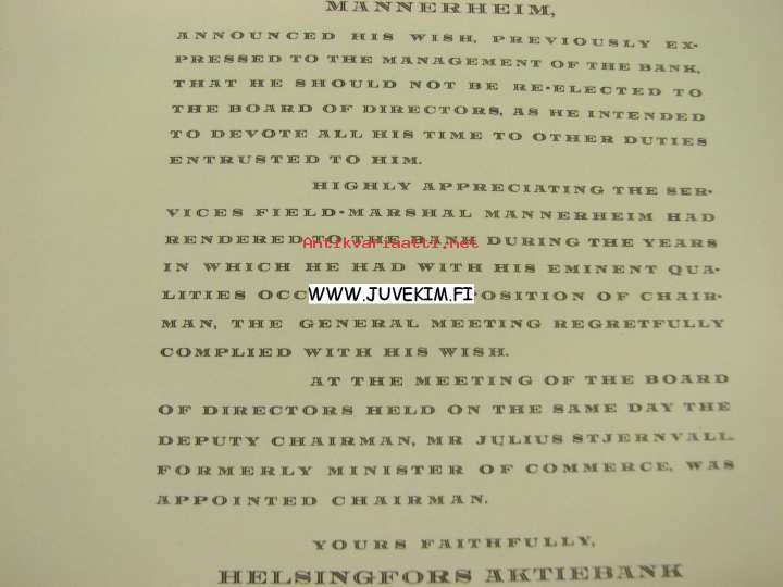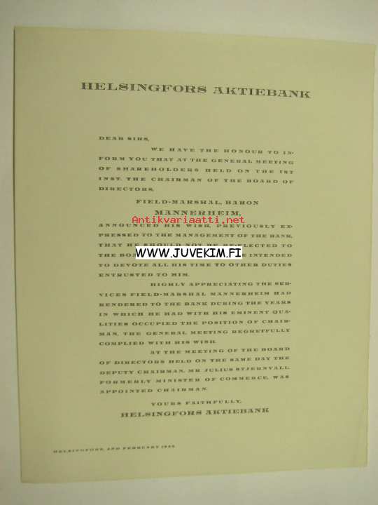Helsingfors Aktiebank, ilmoitus Sotamarsalkka, vapaaherra Mannerheimin erosta pankin hallinnosta 2.2.1935