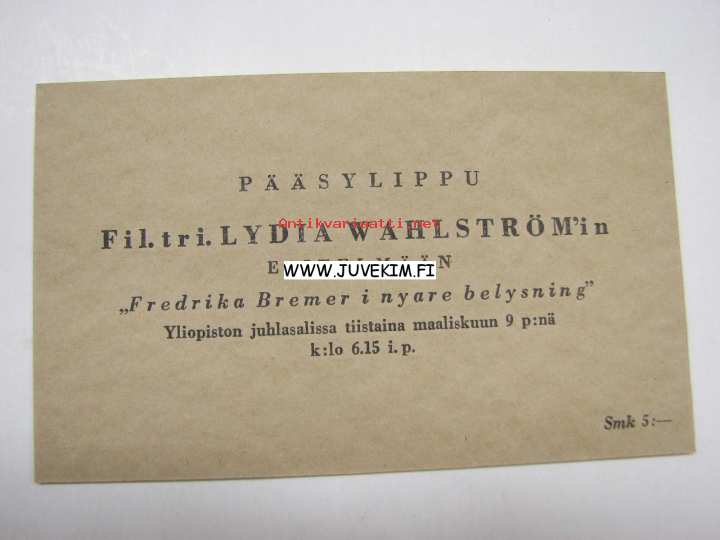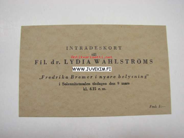 Pääsylippu Fil. tri Lydia Wahlström´in esitelmään "Fredrika Bremer i nyare belysning"