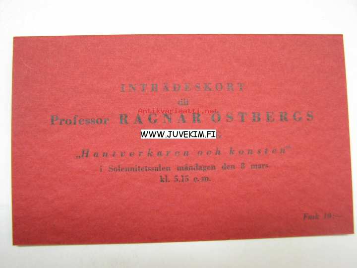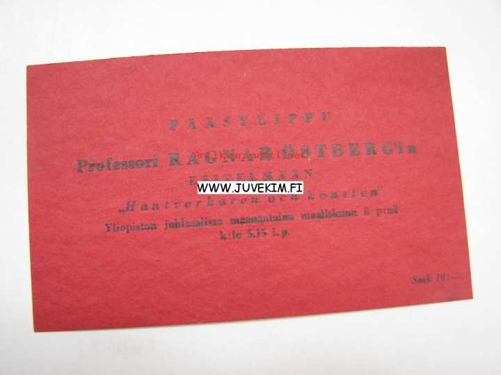 Pääsylippu Professori Ragnar Österberg´in esitelmään "Hantverkaren och konsten"