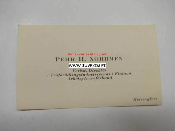 Pehr H. Norrménn, Ph. Mag., Verkst. Direktör i Trädförädlingsindustriernas i Finland arbetsgivareförbund -käyntikortti