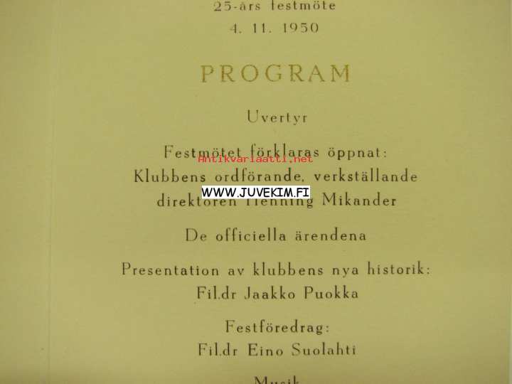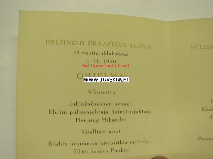 Helsingin Graafisen Klubin 25-vuotisjuhlakokous 4.11.1950 -ohjelmakortti