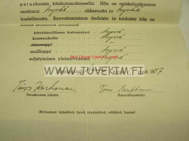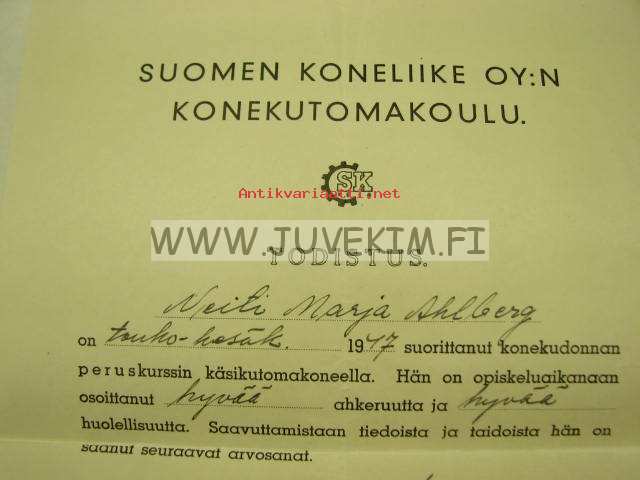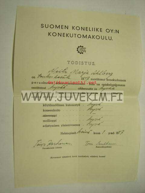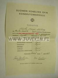 Suomen Koneliike Oy:n Konelutomakoulu -kurssitodistus Marja Ahlberg