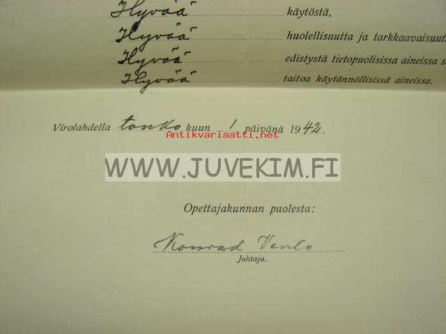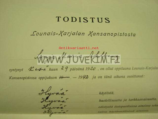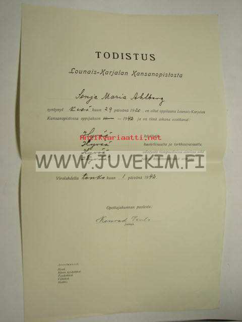 Lounais-Karjalan Kansanopisto, Virolahti -todistus Senja Maria Ahlberg