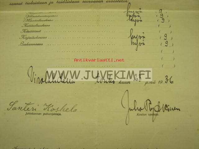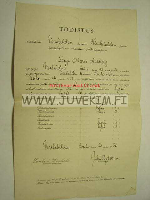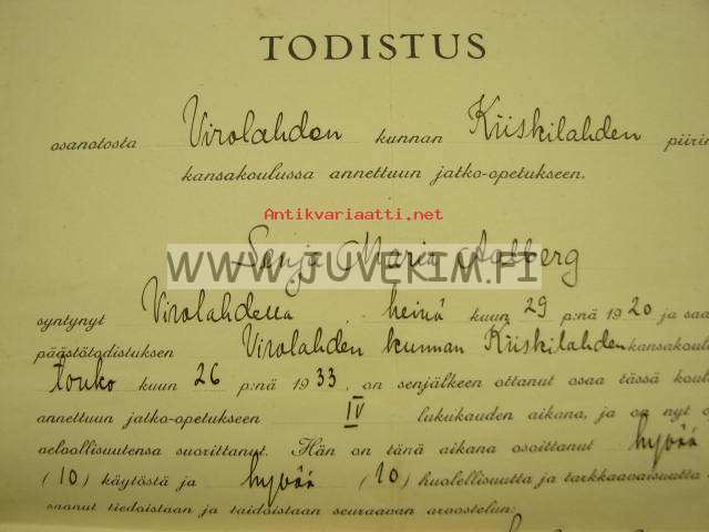 Virolahti, Kiiskilahti kansakoulu Senja Maria Ahlberg -todistus