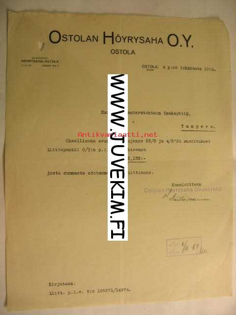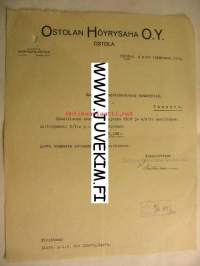 Ostolan Höyrysaha O.Y. Ostola 4.10.1924 -asiakirja