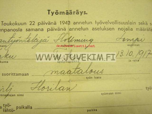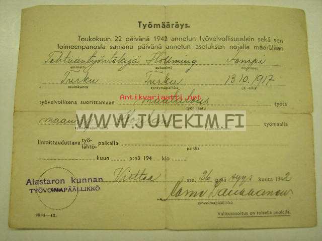 Työmääräys 1942 Lempi Hollming / Alastaron kunnan työvoimapäällikkö -asiakirja