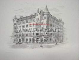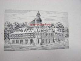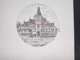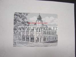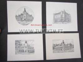 Noin 10 x 10 cm painokuvia apteekkitaloista.