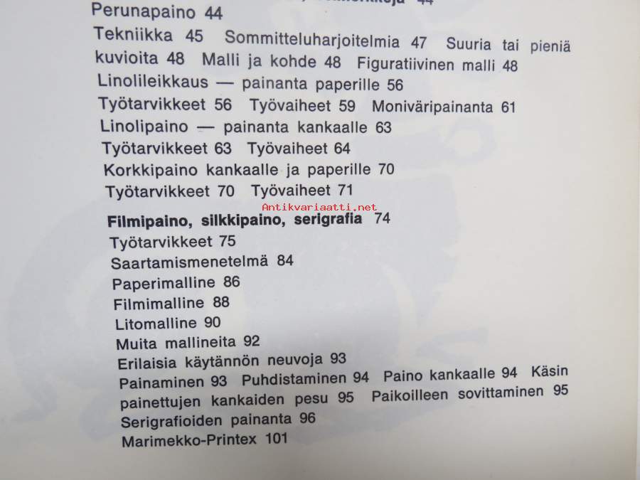 | Saatavilla | 1 kpl | | Julkaisuvuosi | 1972 | | Sivuja | 106 | | Painos | 1. | | Kunto | K2 | | Sidonta/painoasu | Nidottu (pehmeäk.) | | ISBN | 951-30-2052-5 | | Kielet | Suomi |