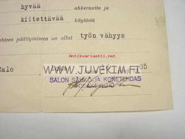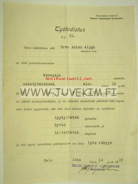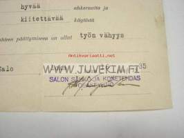 Salon Sähkö- ja Konetehdas 1935 Orvo Alppi -työtodistus