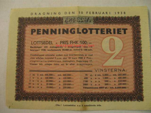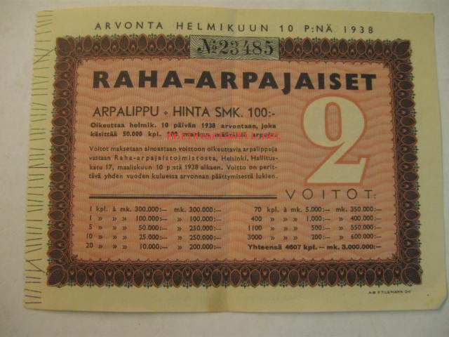 Raha-arpa, Raha-arpajaiset 10.2.1938 -arpalippu