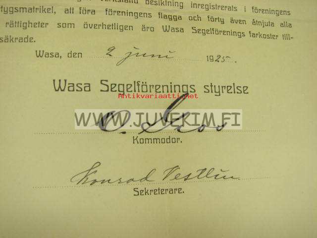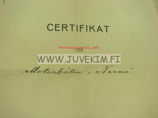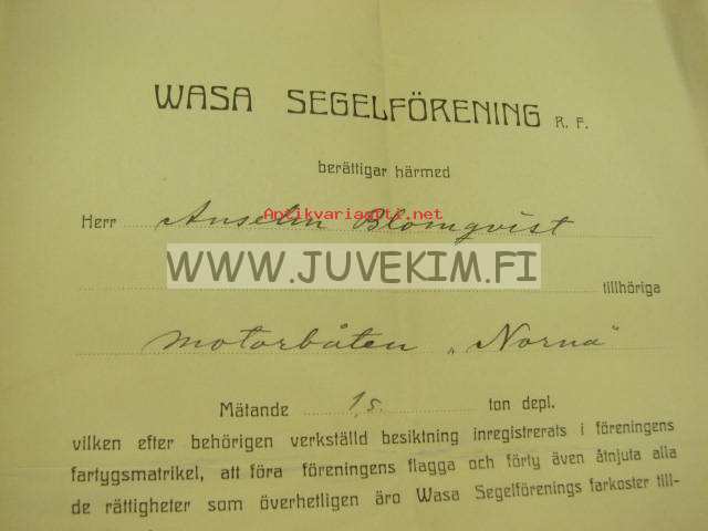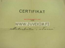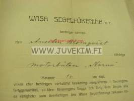 Certificat för motorboten "Norna" 1924 / Wasa Segelförening, Anselm Blomqvist, O. Gros, Konrad Vestlin -Vaasa, huviveneen sertifikaatti
