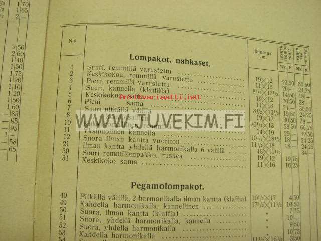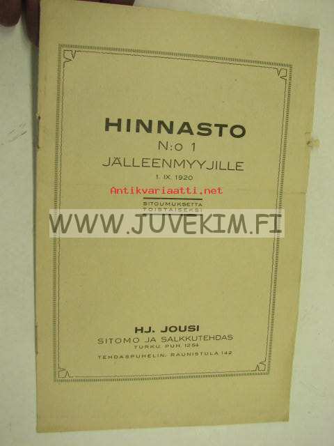 Hj. Jousi Sitomo ja salkkutehdas Hinnasto nr 1 jälleenmyyjille 1920