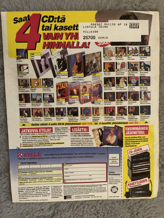 | Saatavilla | 0 kpl (Huom. tuote on myyty! / Sold out!) | | Julkaisuvuosi | 1994 | | Kunto | K3 | | Sidonta/painoasu | Lehti | | Kielet | Suomi |