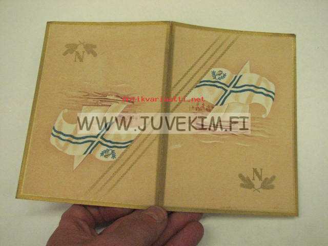Suomen Joutsen - Valtameripurjehtija -purhehduksilla mukana olleen merkki, kangaspohjalle metallilangalla kirjailtu