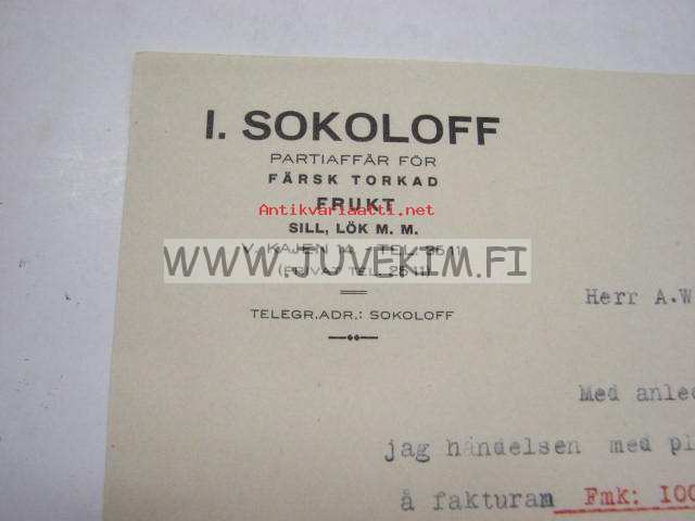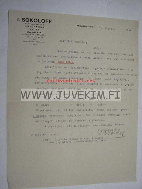 I. Sokoloff Helsinki 3.10.1924 -asiakirja