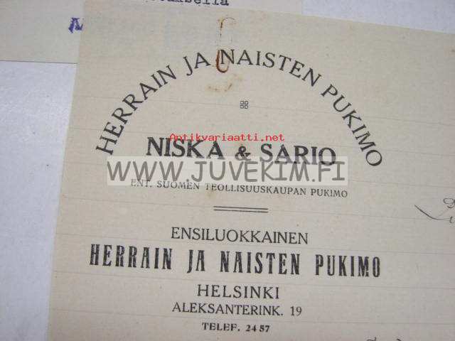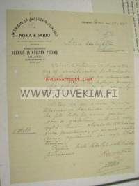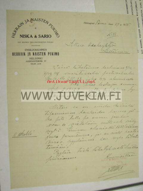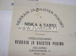 Herrain ja Naisten Pukimo Niska & Sario Helsinki 29.1.1915 -asiakirja