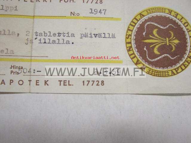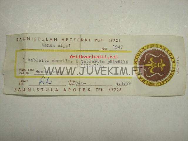 Raunistulan Apteekki Turku 3.3.1959 -apteekkisignatuuri